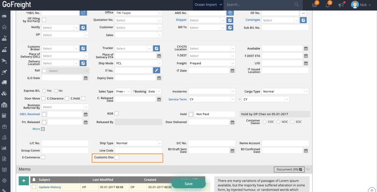 For every Ocean Import HB/L, there’s now a “Customs Doc” checkbox. Once you have sent the customs documents to the broker, you can check the box as a reminder.
