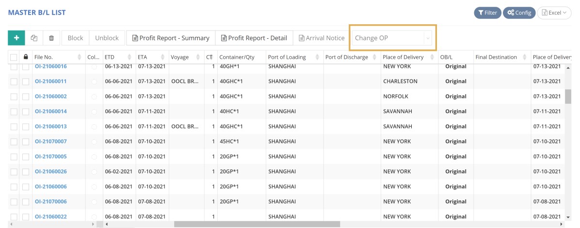 Editing the OP of specific shipments one by one can be a time-consuming task. Now, you can select all the shipments that you wish to modify in the list view and change all the OP at once using the “Change OP” field.